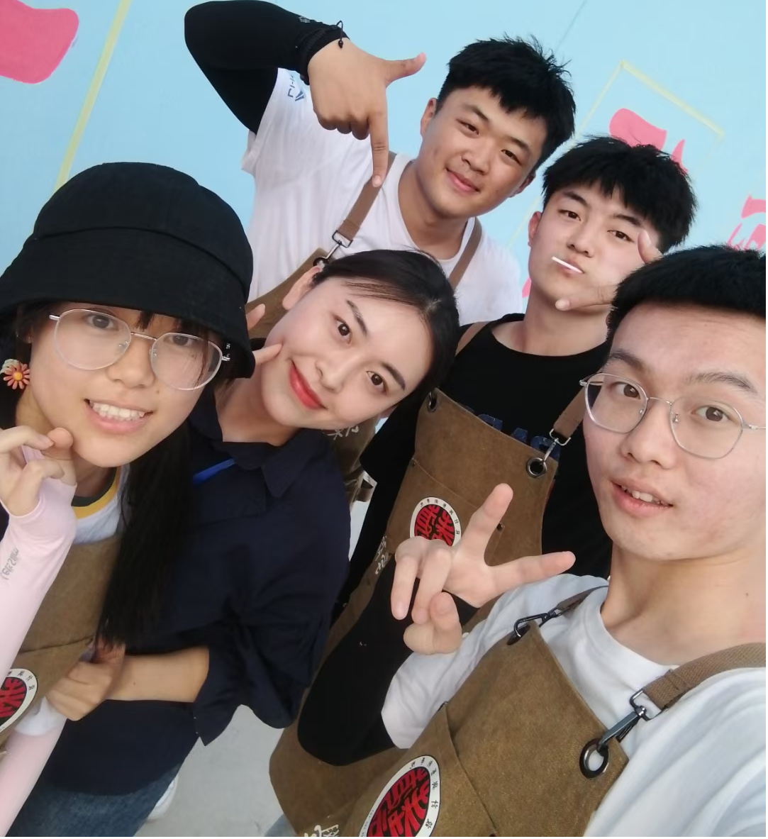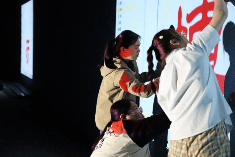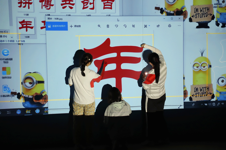 为保证字体结构美观,字间距准确,吕倩、韩宁、罗琳琳老师带领学生利用9.10节时间使用投影设备精准确定位置和字形。随后以小组分工的形式完成铺底色及字体颜色填充等工作,过程繁琐,对细致度要求较高,磨练了同学们的耐力和毅力,学生们之间的积极配合也体现了当代大学生较好的精神风貌。