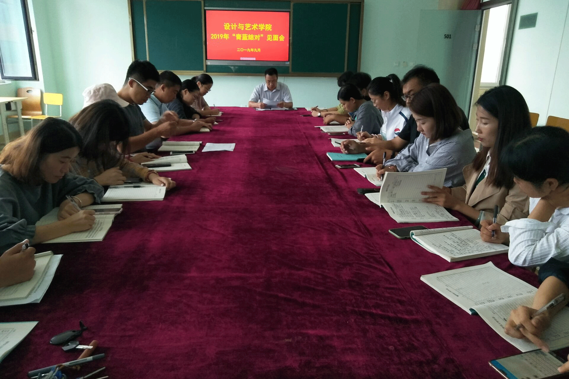启动仪式分为四项议程:第一项议程宣读2019年“青蓝结对”分组情况;第二项议程学习《辅导员“青蓝结对”实施办法(试行)》;第三项议程“青”、“蓝”方辅导员发言,张群科长表示将切实担负起“蓝”方辅导员的责任,主动帮助“青”方辅导员解决问题,帮助“青”方辅导员成长。“青”方辅导员李如一老师表示将会虚心向“蓝”方辅导员学习,主动请教、积极交流,以尽快适应岗位需求;第四项议程,学院副院长刘光晓总结发言,并提出三点要求,第一,要求“青”方辅导员主动寻求“蓝”方辅导员在业务、思想方面的指导,虚心请教;第二,要求“蓝”方辅导员认真负责,站在学校和工作的角度上,言传身教,传播正能量;第三,要求双方要珍惜平台,珍惜机会,教学相长,彼此进益。