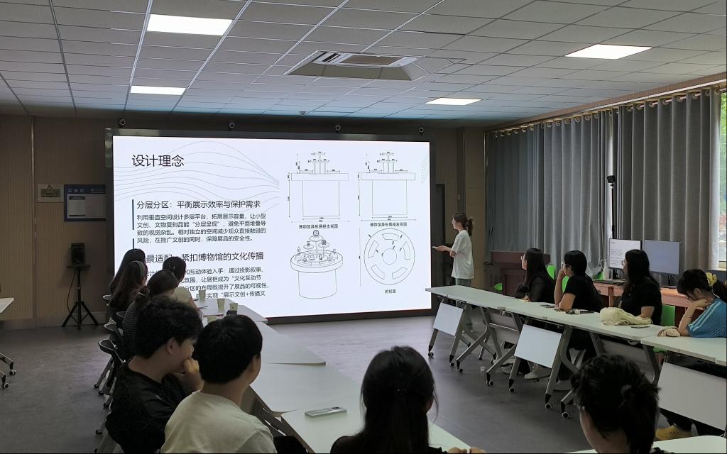 会上,太阳集团网址8722学生们展示了为德州市博物馆设计的展柜方案,博物馆徐主任从文物保护、观众体验、安全规范等维度提出专业建议,在点评中强调:“展柜设计需兼顾‘文物保护’与‘观众体验’的双重使命。”展柜的层板高度应符合人体工程学标准。例如,针对儿童观众群体,可设计升降展台或倾斜式展柜,保证参观体验感。针对部分方案的结构规范,博物馆刘主任建议提高开放式展柜的安全性并考虑增加文创产品展柜的下层储物空间。