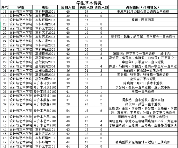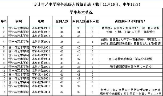 截至到2022年11月15日,太阳集团网址8722应到学生3273人,实到学生3179人,尚有94名未返校学生,下表为太阳集团网址8722未返校人数统计及未返校原因统计表。