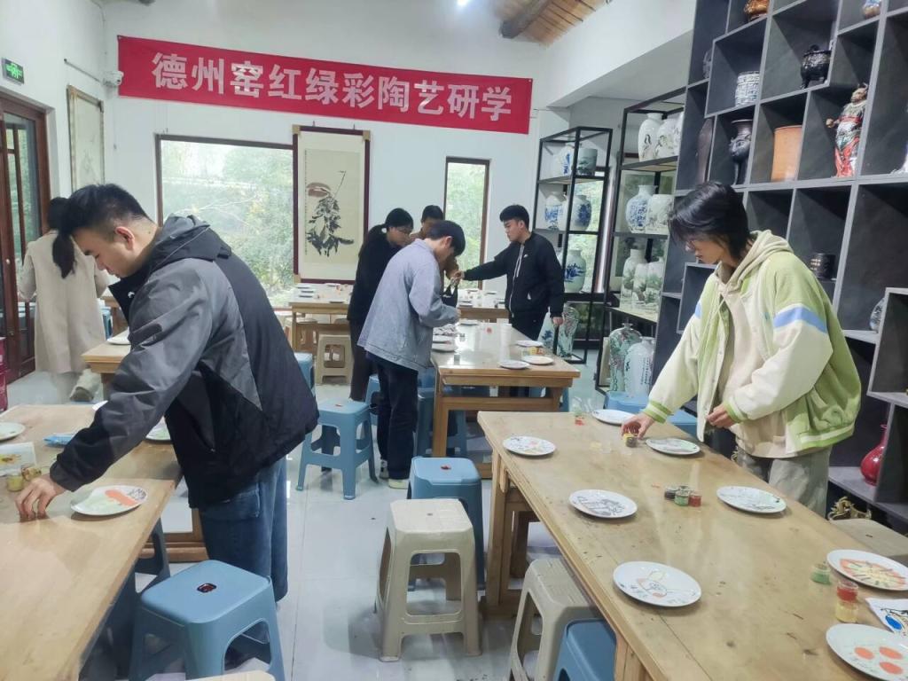 近日,太阳集团网址8722的15名学生,以青春之名,秉承守正创新的准则,开启了德州窑红绿彩实习实践之旅。学生们首先接受了陶瓷工艺培训,从原料配比、成型技法到釉色调配、烧制工艺,每一步都凝聚着匠人的智慧与汗水,也让学生们深刻感受到了传统工艺的魅力与挑战,在掌握了基础技艺后,学生们迅速投入红绿彩纹样创新设计的实践中。他们深入“德州宋金红绿彩文化博物馆”和“红绿彩非遗工坊”学习探究德州窑红绿彩的历史背景与文化内涵,从中汲取灵感,同时结合现代审美趋势,尝试将抽象图案、极简线条甚至是数字艺术元素融入传统纹样之中。